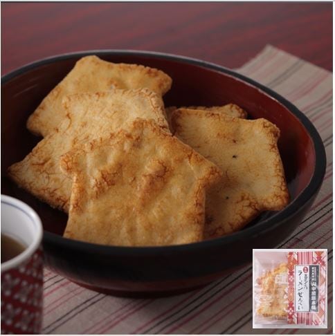 ラーメンスープで味付けし、粗挽きコショウがきいた堅焼きせんべい。